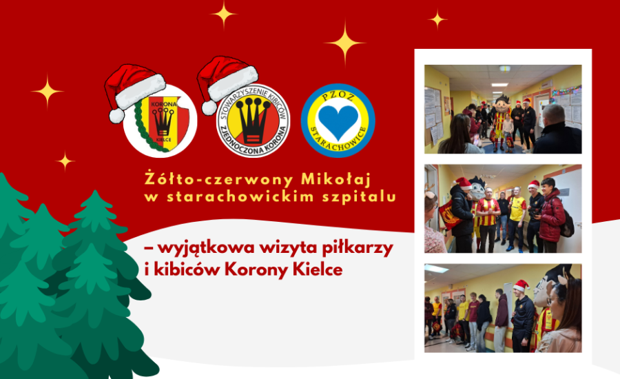 W sobotę, 6 grudnia, Powiatowy Zakład Opieki Zdrowotnej w Starachowicach odwiedzili wyjątkowi goście. Piłkarze Korony II Kielce – Piotr Rogala i Nikodem Kuzera, były zawodnik Korony, a obecnie asystent trenera rezerw Krzysztof Kiercz, przedstawiciele klubu, kibice ze Stowarzyszenia “Zjednoczona Korona” oraz klubowa maskotka „Scyzio” – wcielili się w rolę żółto-czerwonych Mikołajów, by sprawić radość najmłodszym pacjentom naszego Szpitala.