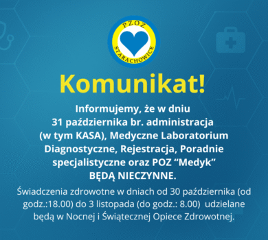 Komunikat! Informujemy, że 𝘄 𝗱𝗻𝗶𝘂 𝟯𝟭 𝗽𝗮𝘇́𝗱𝘇𝗶𝗲𝗿𝗻𝗶𝗸𝗮 𝗯𝗿. 𝗮𝗱𝗺𝗶𝗻𝗶𝘀𝘁𝗿𝗮𝗰𝗷𝗮 (w tym KASA), 𝗠𝗲𝗱𝘆𝗰𝘇𝗻𝗲