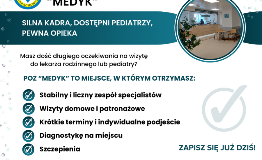 Masz dość długiego oczekiwania na wizytę do lekarza rodzinnego lub pediatry – szczególnie w sezonie zimowym?POZ „Medyk” w Starachowicach to nowoczesna Podstawowa Opieka Zdrowotna z rozwijającą się kadrą, dużą dostępnością pediatrów oraz szeroką