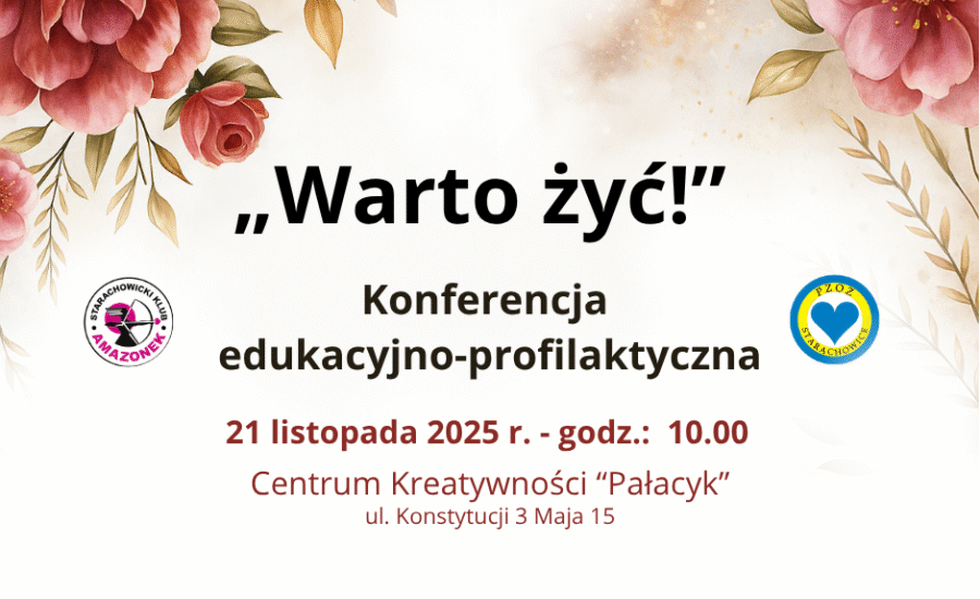 Starachowicki Klub Amazonek oraz Powiatowy Zakład Opieki Zdrowotnej w Starachowicach serdecznie zapraszają mieszkańców miasta i powiatu na wyjątkową konferencję „Warto żyć!”, poświęconą zdrowiu, profilaktyce oraz wsparciu kobiet po leczeniu onkologicznym. Wydarzenie odbędzie się