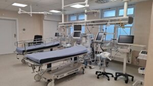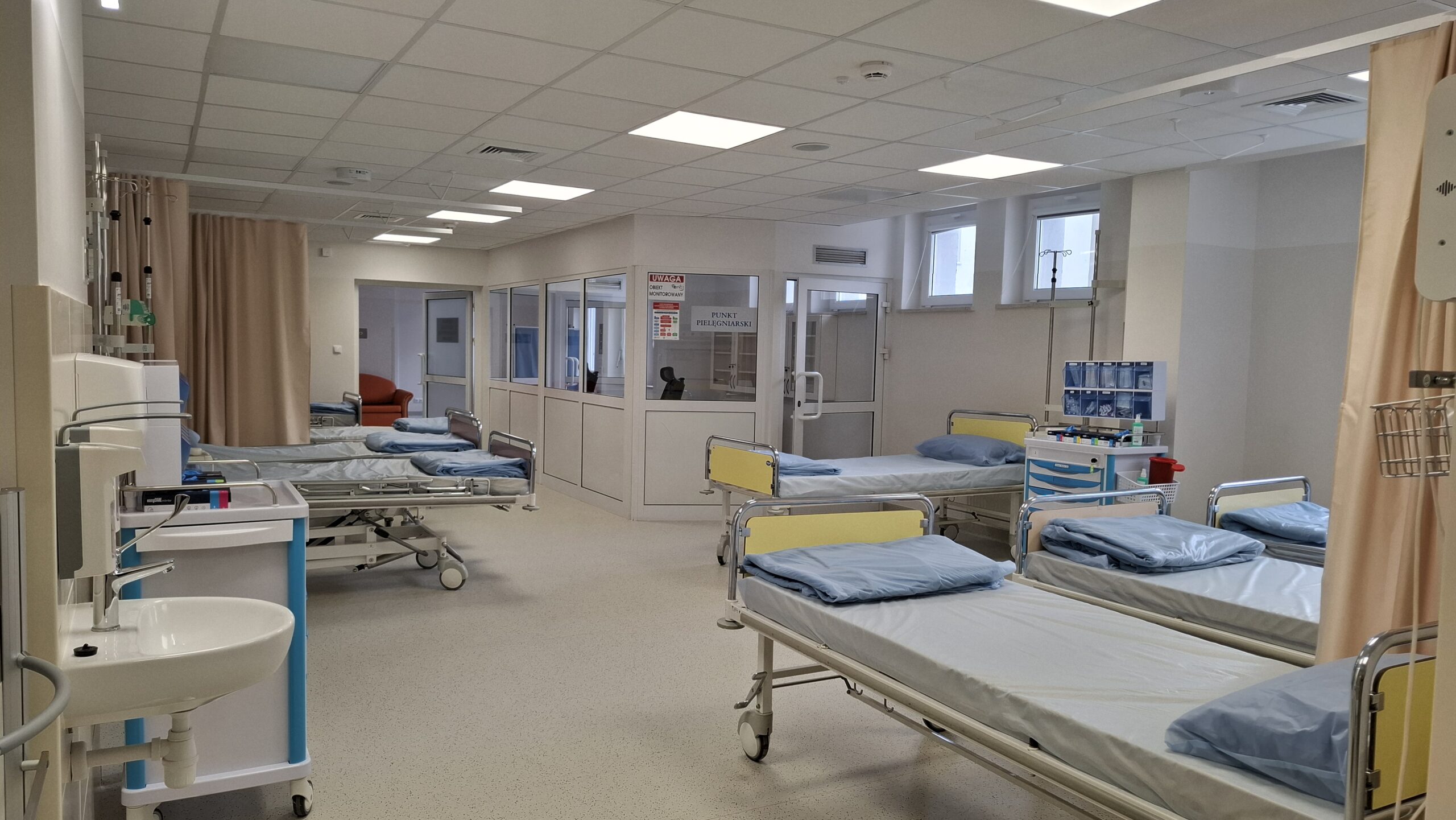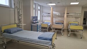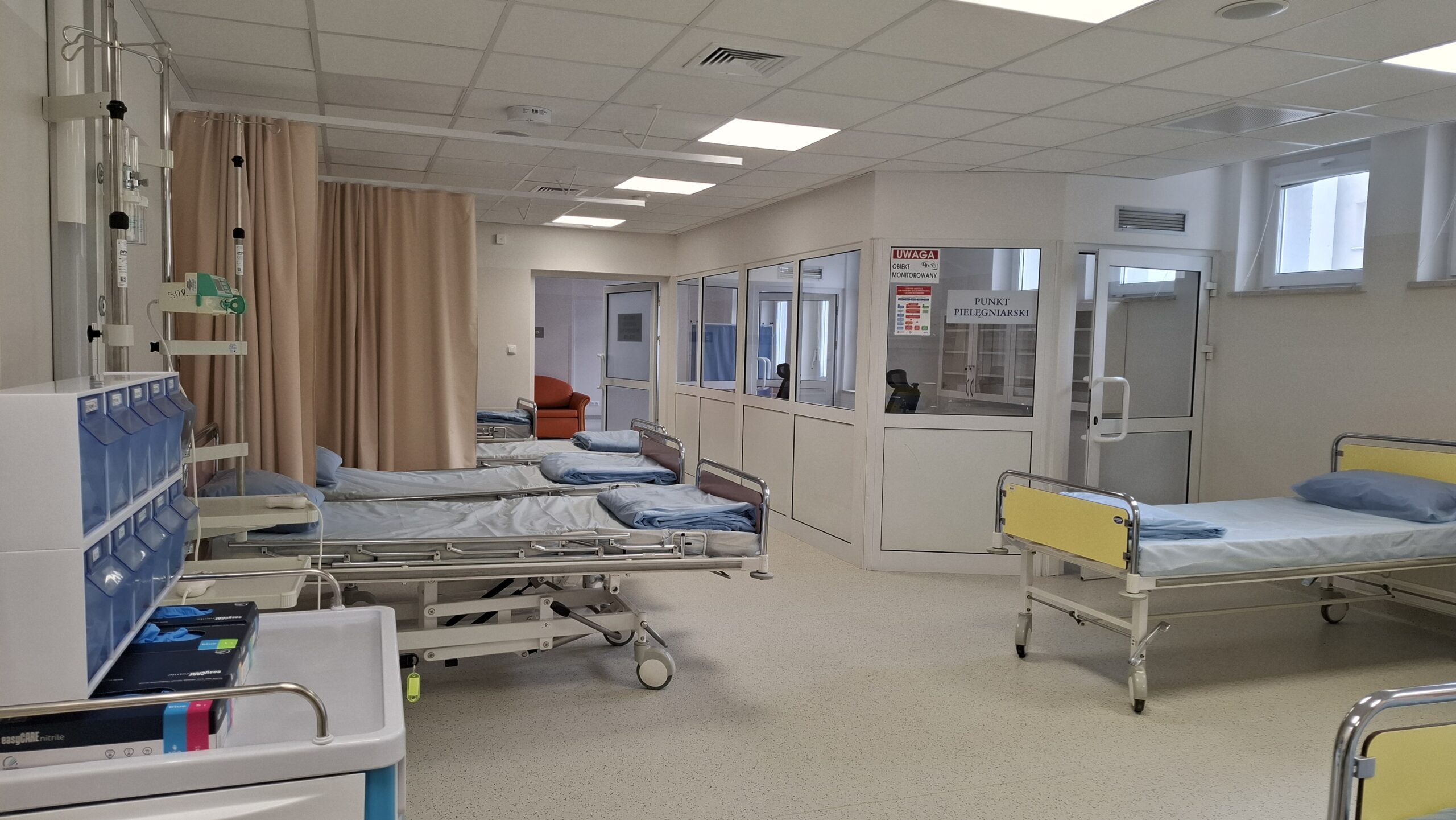 🔹 Oddział Intensywnego Nadzoru Kardiologicznego: system monitorowania pacjentów z centralą i monitorami, pompy infuzyjne, stymulatory zewnętrzne, materace grzewcze, wózki reanimacyjne, urządzenia do pionizacji pacjentów.